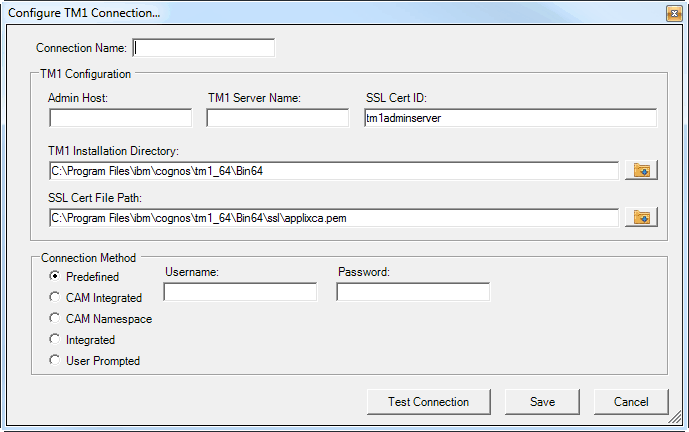 The "TM1 Connection" configuration dialog with then appear with some defaults preloaded.