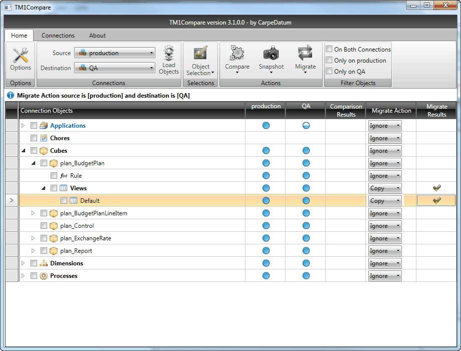 ❑Ignore: ▪This default action will ignore the object in migrations. ▪Actions performed on parent objects may have an affect on child objects, even if the "Ignore" action is chosen. For example, copying or deleting a dimension by design will result in changes to its members. Once the decision has been made which objects will be migrated and migrate actions have been selected, click the "Migrate" [